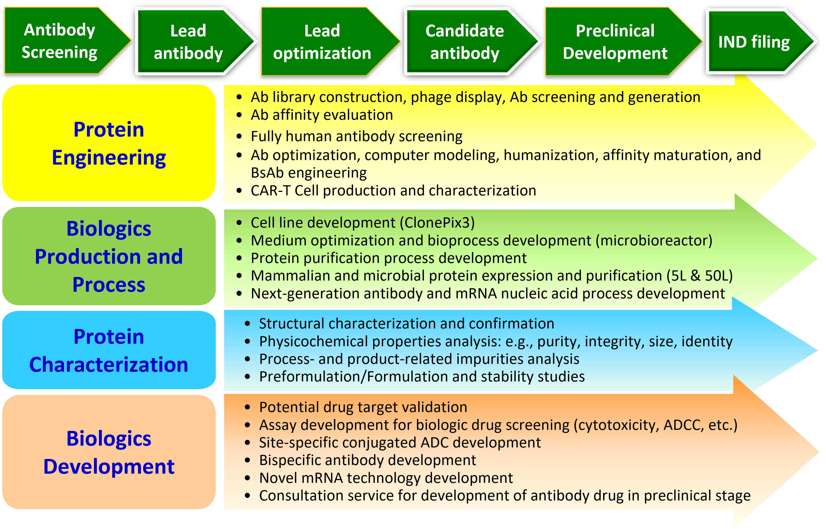 In addition to new drug development, the Institute of Biologics also provides services to the academic community and biotechnology industry. These services include antibody screening and engineering, cell line development, protein expression, process development, functional assays, protein characterization and cell line engineering.