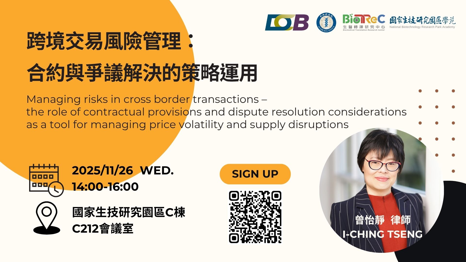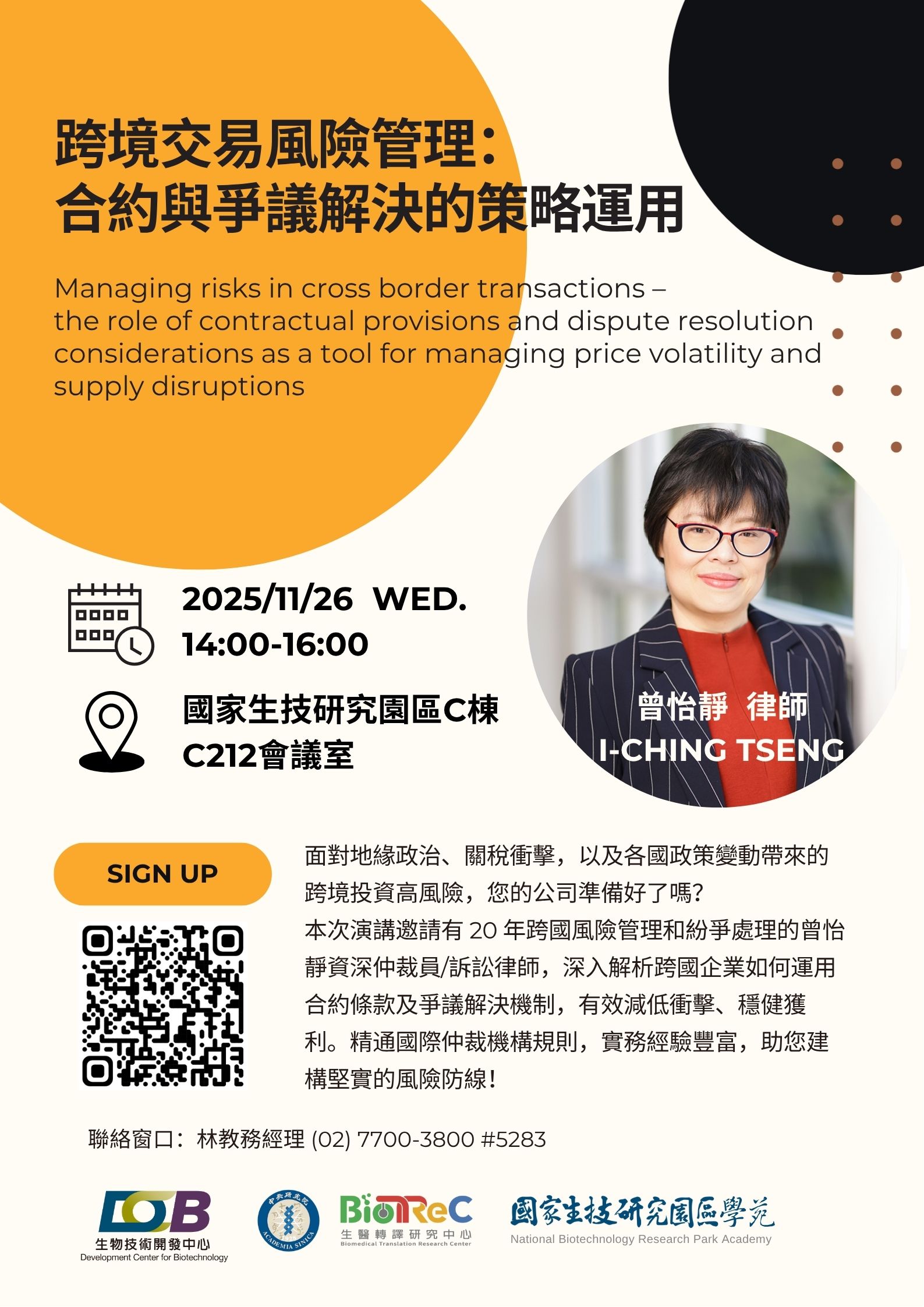 隨著全球政經局勢動盪,像是新冠疫情、烏克蘭戰爭、貿易關稅等因素的影響,國際市場的原物料價格和跨國投資成本劇烈波動,企業面臨越來越高的風險。特別是政府政策的不確定性,使得跨境交易和投資的風險進一步加劇。在這樣的背景下,企業如何有效進行風險管理,保護自己的商業利益,成為全球運營中至關重要的課題。此次演講將介紹國際上如何使用合約的條款以及爭議解決機制減低相關的衝擊以及風險。
