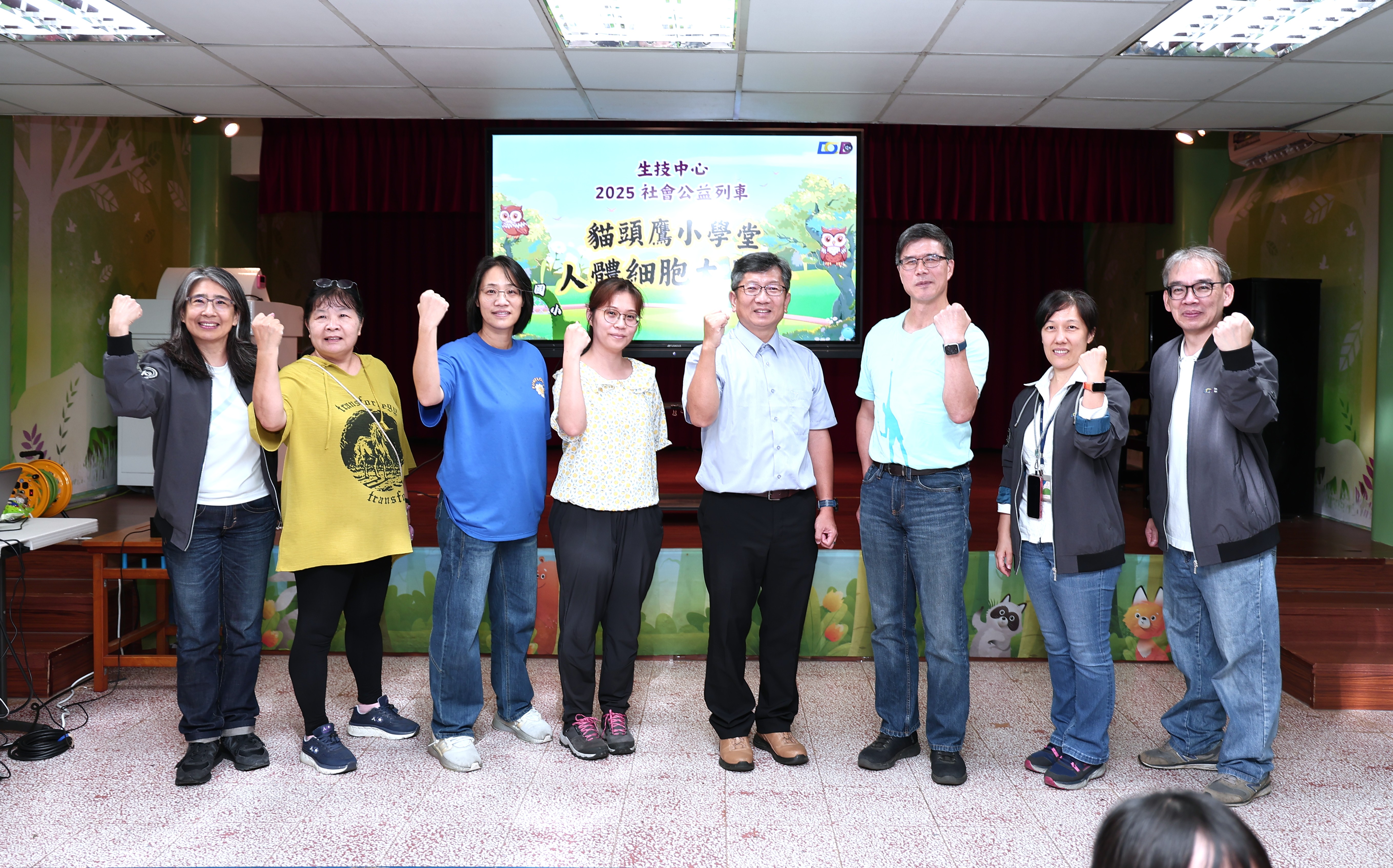 生技中心舉辦的「貓頭鷹小學堂:人體細胞大冒險」社會公益活動,由大家長李財坤執行長及陳綉暉副執行長領軍,透過深入淺出的互動課程與生動活潑的解說,引領嘉寶國小五、六年級學生走進「人體的生命城市」。