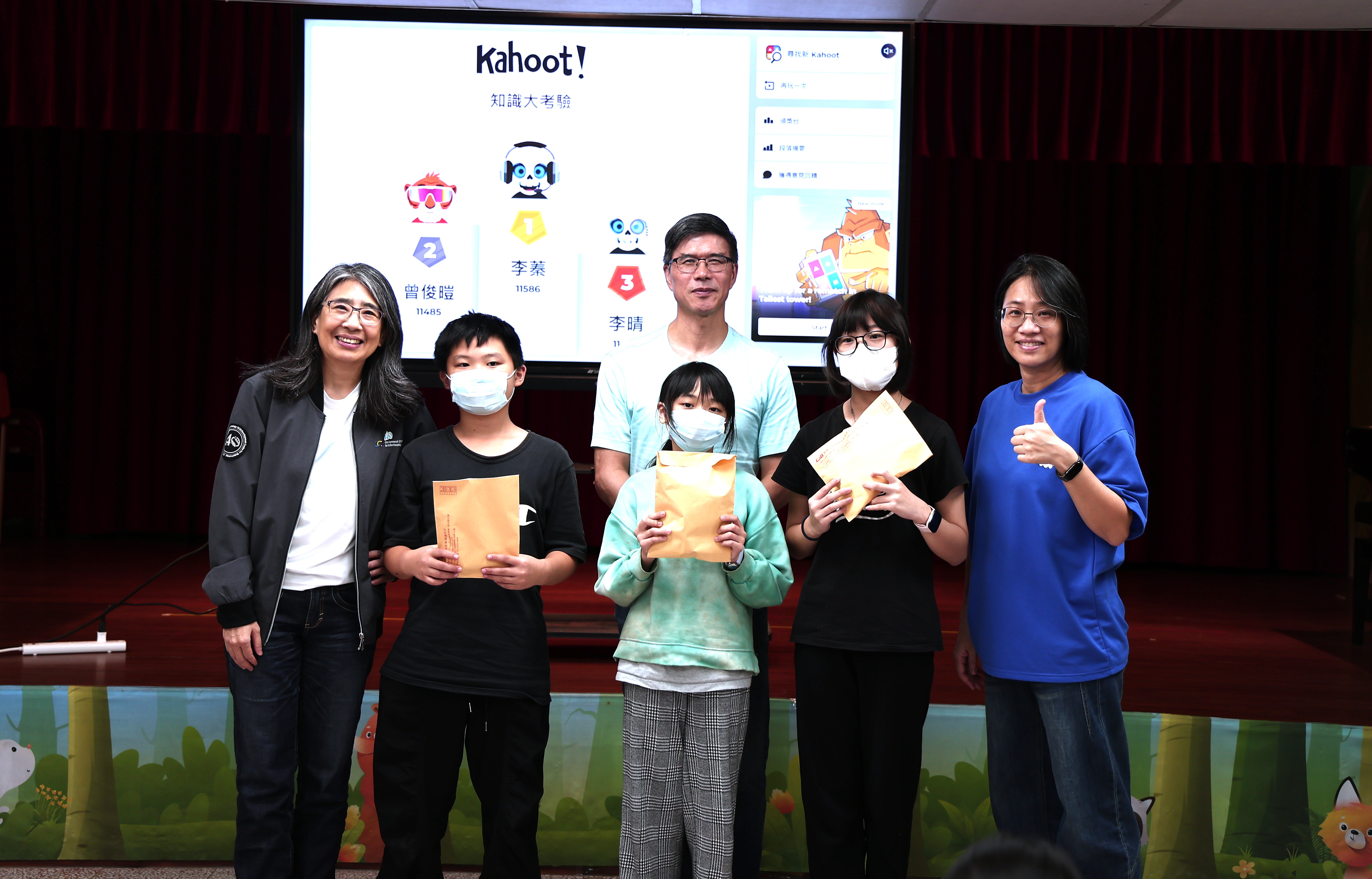 學童透過搶答遊戲,更深入理解生物學和健康概念,由生技中心李財坤執行長(中)、陳綉暉副執行長(左)、和嘉寶國小謝鎔襄主任(右)共同頒發獎品予優勝者。