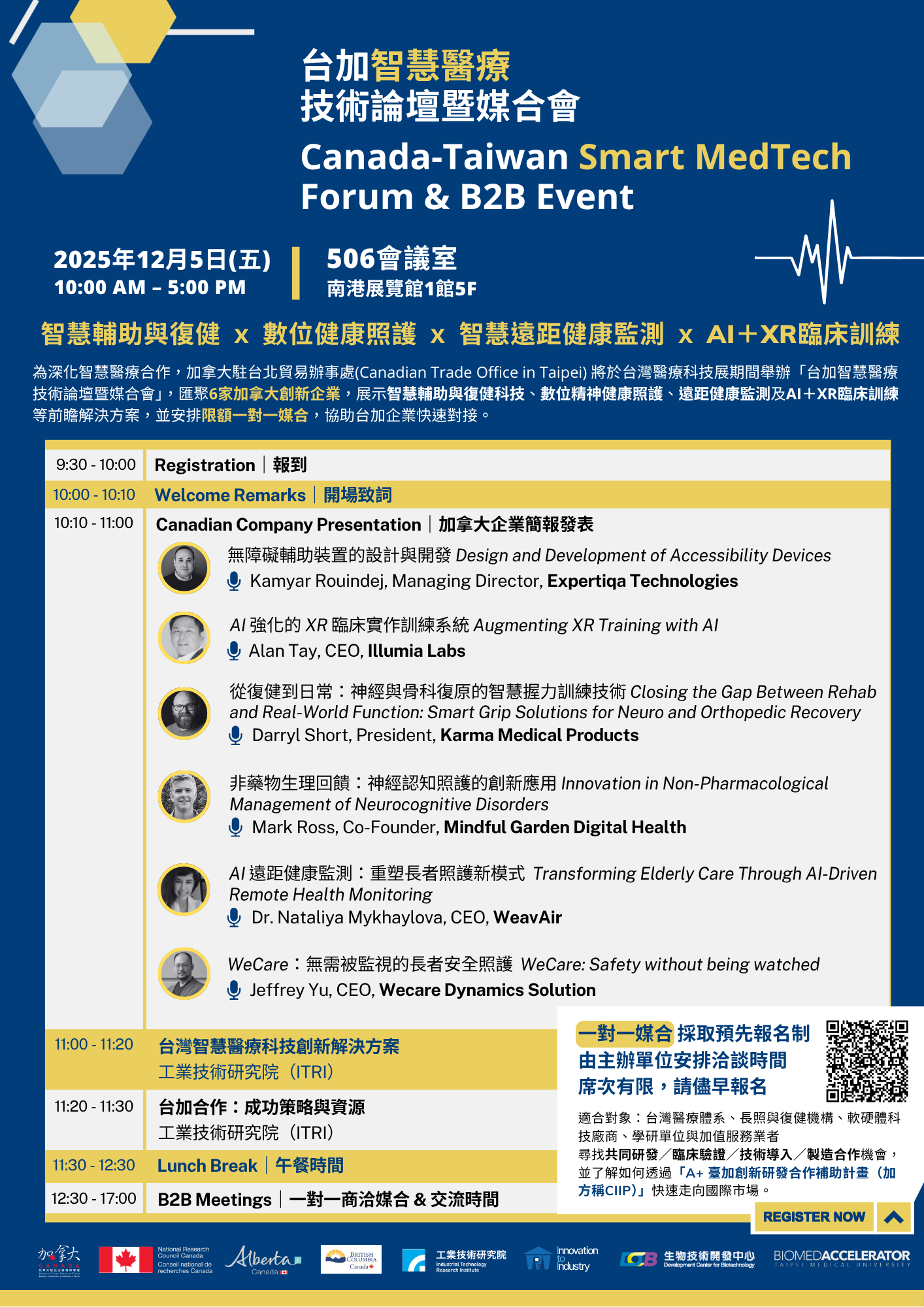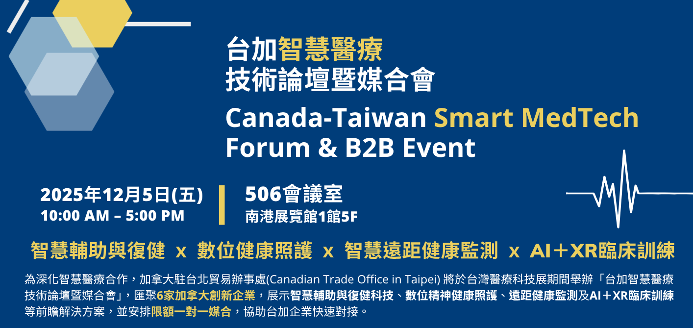 為深化台加智慧醫療合作,加拿大駐台北貿易辦事處(Canadian Trade Office in Taipei) 將於2025/12/5(五)在台灣醫療科技展期間舉辦「台加智慧醫療技術論壇暨媒合會」。活動匯聚6家加拿大創新企業,聚焦智慧遠距健康監測、數位精神健康照護、智慧輔助與復健科技及AI+XR臨床訓練等前瞻解決方案,並開放報名與加拿大企業進行一對一媒合。誠摯邀請台灣醫療體系、長照與復健機構、軟硬體科技廠商、學研單位與加值服務業者參與,尋找共同研發/臨床驗證/技術導入/製造合作機會,了解如何透過台A+臺加創新研發合作補助計畫,讓具創新性與市場潛力的技術走向商業化與海外市場。