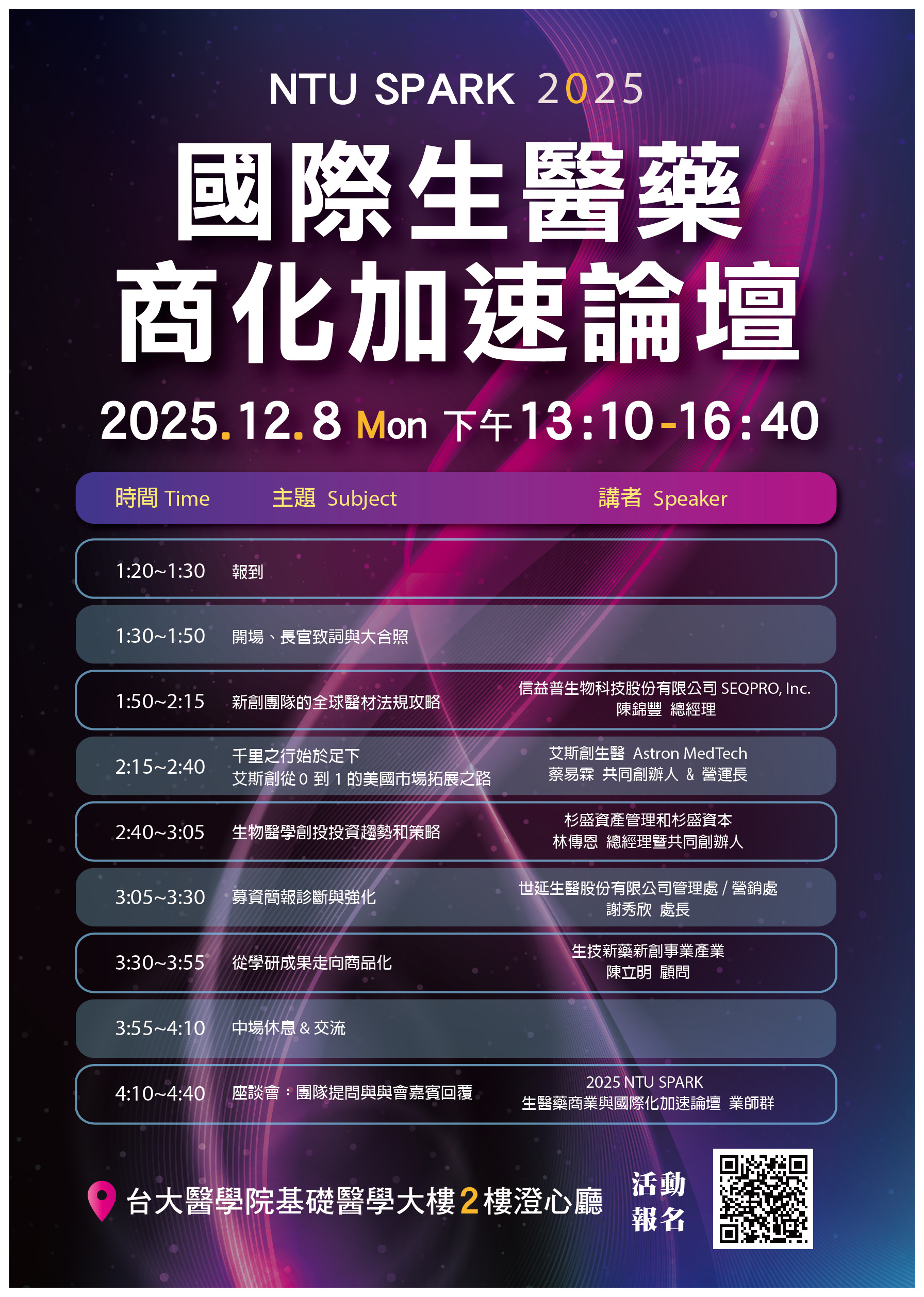 無論您是學研團隊、生醫新創、技術經理或投資者,這場論壇都將是您加速產品商業化、提升募資競爭力的最佳機會!
