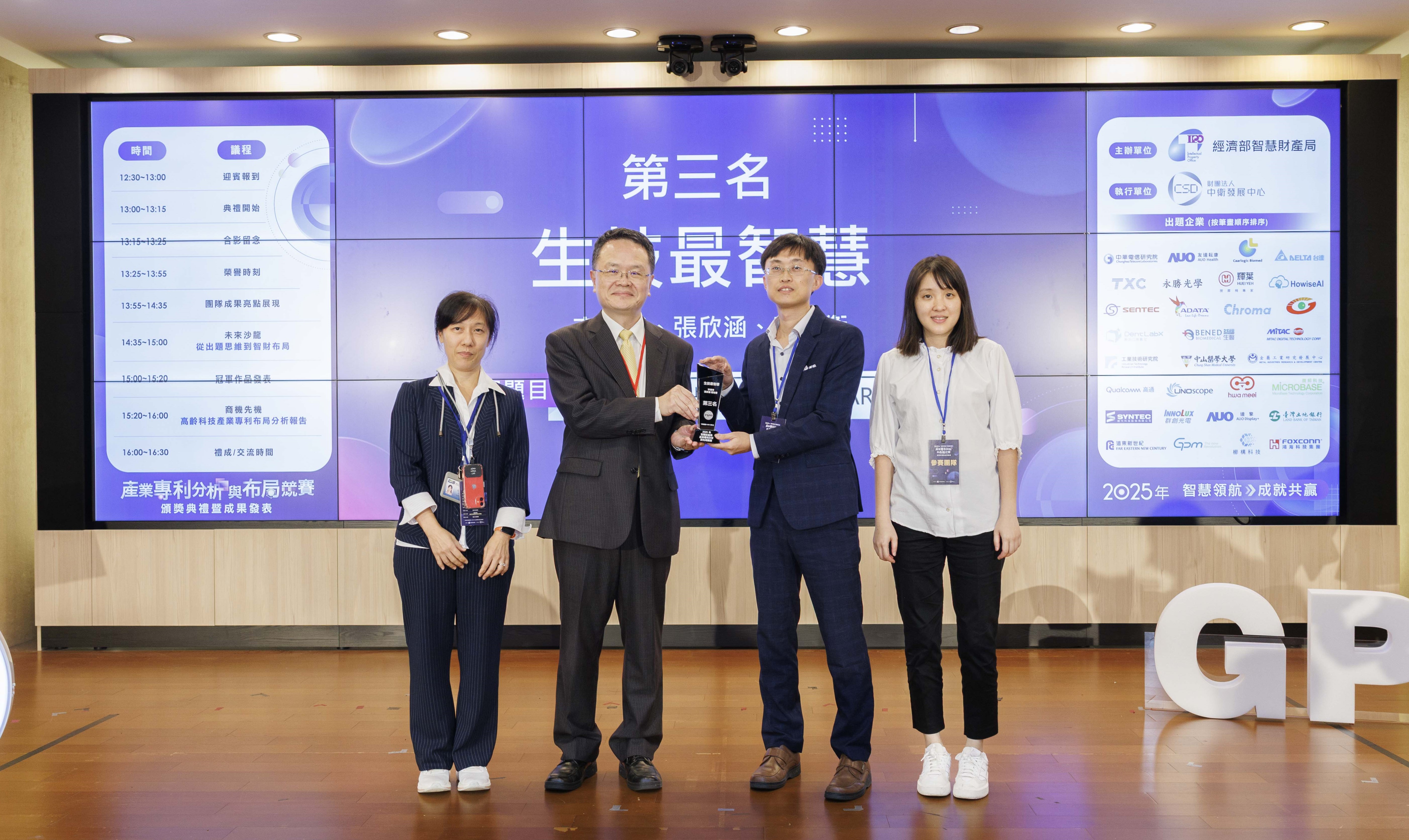 生技中心於經濟部智慧財產局舉辦的「2025年產業專利分析與布局競賽」中表現亮眼,由跨單位成員組成「生技最智慧」團隊從七十支參賽隊伍中脫穎而出,成功晉級十六強複賽,在最終決選中勇奪全國第三名佳績。充分展現生技中心在專利與產業分析的深厚實力,也彰顯團隊合作所匯聚出的專業競爭力。