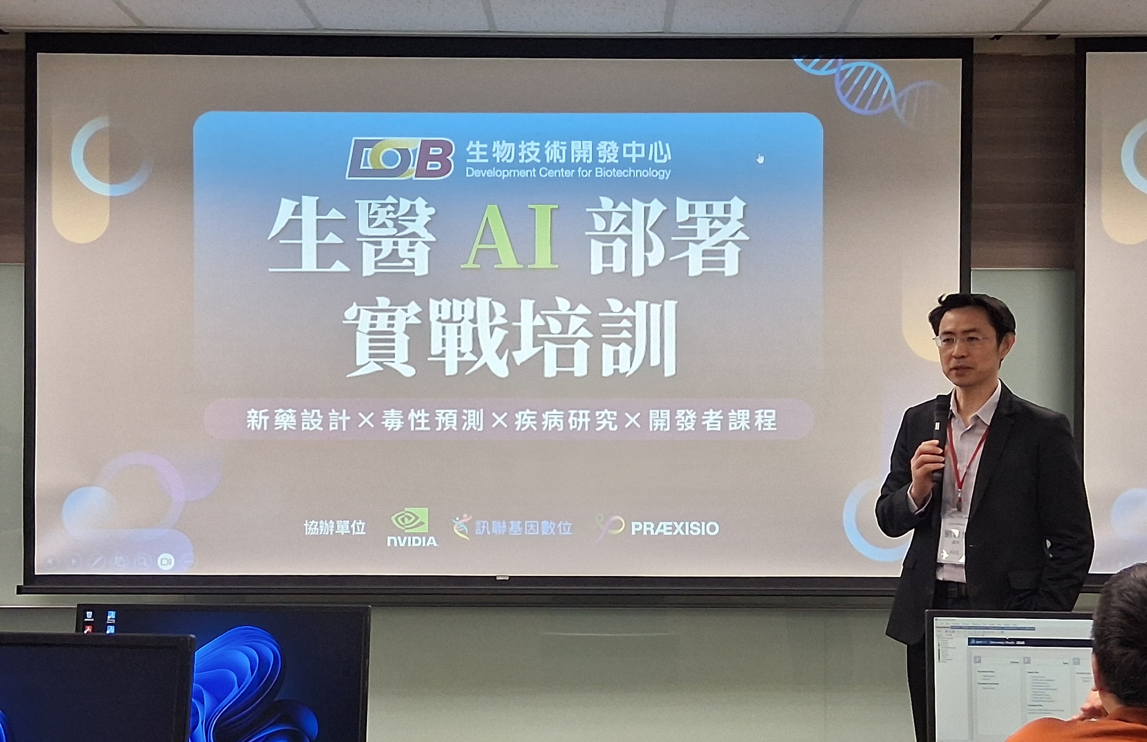 由生物技術開發中心(DCB)主辦,以及NVIDIA、訊聯基因數位(股)有限公司與Praexisio, Inc. 協辦之「生醫AI部署實戰培訓」系列課程,已於2025年11月之每週五,於國家生技園區D棟電腦教室順利舉行。因應AI技術不斷革新傳統藥物開發,DCB產業發展處辦理本系列課程,以協助產業培養AI藥物開發之人才為目的,透過小班制工作坊形式,手把手帶領學員熟悉特定AI軟體工具與藥物開發邏輯,加速生醫領域導入AI開發專案。課程共規劃兩大模組,模組一以產品開發需求為主,進行蛋白質結構優化與小分子篩選,涵蓋從毒性評估到劑型改良的完整應用,協助加速生醫產品研發;模組二以開源工具與新興AI技術平台為導向,聚焦藥理與疾病研究、分子毒性預測,加速疾病理解與藥物探索,同時協助開發者熟悉相關工具,在新藥開發情境中導入生成式AI,建立高效流程。
