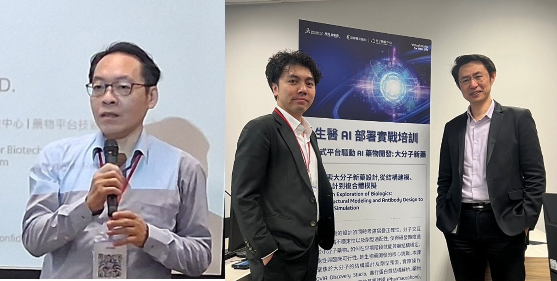 生物技術開發中心柯屹又組長以「AI 加速小分子新藥:從蛋白質結構到活性化合物探索」為題,以BIOVIA Discovery Studio平台操作示範如何以新藥設計和資料庫篩選兩大策略,透過以結構基礎之設計、QSAR分析,以及分子對接操作,有效縮小候選分子的範圍,提高找到活性化合物的機率。BIOVIA Discovery Studio是由達梭系統(Dassault Systèmes)開發的生物科學研究平台,能整合實驗資訊與分子建模等模擬工具,作為AI藥物開發領域的一站式數位實驗室。BIOVIA於藥物優化已有不少成功案例,在一個優化先導化合物的案例中,使用BIOVIA僅需花費比傳統方法少50%的時間,即可成功辨識出新的化合物結合位點,並生成20個全新分子。在另一個開發抗移植排斥藥物「JAK3 Tyrosine激酶抑制劑」的案例中,BIOVIA以物理基礎(physics-based)和結構基礎(structure-based)的分子設計方法,辨識核心化合物的可修飾位點,生成多個具高選擇性的候選化合物,有效改善原先化合物的藥物選擇性,並推進至最終產品上市階段。